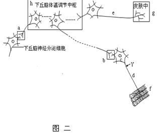 (2)寒冷时的体温调节以 调节为主。请依次用图二中编号和箭头表示该调节方式的结构基础: (顺序写错不得分)。图二中的c细胞所处的中枢神经系统结构是 。