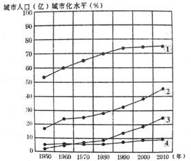 21.图中四条曲线分别代表发展中国家城市化水平、发达国家城市化水平、发展中国家城市人口和发达国家城市人口,它们对应的曲线分别是
