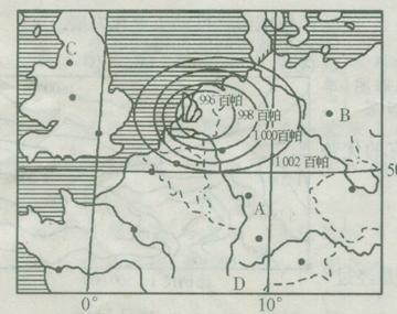 1)出发前,中国队员从网上查到:图中所示的天气系统正在向正东方向运动,预计72小时将完全从B城过境,请你帮助他们预测B城未来72小时的天气变化过程。(4分)