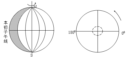 (5)在右图中将左图改画成北极为中心的俯视图,画出晨昏线并用阴影表示黑夜,标出昼半球中央经线。