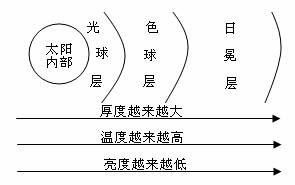 1.各层太阳大气的特点:光球层:厚度最小,温度最低,亮度最高;日冕层:厚度最大,温度最高,亮度最低;色球层的厚度、温度和亮度都介于光球层和色球层之间。
