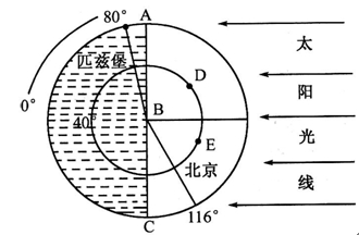 (1)在图中左上角弧线上未指出地球的自转方向,如果补上应为_____时针方向。 (2分) (2)A在D的______方向,C在北京的______方向。 (4分) (3)写出下列两城市的经纬度位置:①北京:__________②匹兹堡:___________ (4分) (4)一架飞机从北京起飞,计划全程沿经线以每小时1100km的速度匀速飞行,由北京经过B点,最后在匹兹堡降落。请回答: ①飞机飞行需要______小时。 (2分) ②飞行依次途经的国家有中国、______、______、______、______。 (4分) ③假若此时起飞时北京的区时为3月21日8时, 那么降落时匹兹堡的区时应为3月______日______时。(4分)