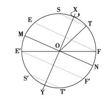 13. 解析:(1)以极点为中心的经纬网图上显示了北半球的城市,可见中心应为北极点;(2)先定南北、再定东西的方法可以简单求解。A点在D点南方,按照自转方向A点在D点东方,合为东南方向;同理,C在北京西南方向;(3)直接从图中读取。对北京位于东半球、北半球要有基本的方位概念,匹兹堡位于西经80°可以通过经线排列关系确定。(4)飞行路线是解题的关键,题中“从北京沿经线飞行、过极点,(再沿经线飞行)到达匹兹堡”,飞行路线跨过北京以北的50°纬度、匹兹堡以北的50°纬度。①飞行距离应该是(50+50)×111千米÷1100km/H=10。②依次经过的国家有美国和中国北方的国家。③起飞时匹兹堡的区时是3月20日19点(向东过日界线减一日),10小时后为3月21日5时。 [答案](1)逆时针方向;(2)东南、西南;(3)北京为40°N,116°E;匹兹堡为40°N,80°W。(4)①10小时;②蒙古、俄罗斯、加拿大、美国;③3月21日3时 14.(24分)如右图XOY为地轴,MN为赤道,EF、E′F′为回归线,ST、S′T′为极圈。读图回答问题。