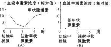 (3)若将C组其中一只兔子的甲状腺切除。并从第3周开始每天注射适量的甲状腺激素, 则该兔子血液中甲状腺激素含量变化如图(A)所示.请在图(B)中用虚线画出l-5周内促甲状腺激素在血液中含量的变化曲线。