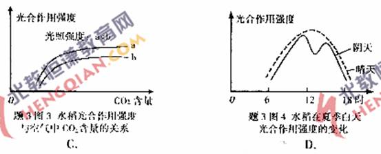 3.在题3的图中,图1图2为不同材料叶绿体中色素的层析结果(示意图),图3,图4为不同条件下水稻光合作用强度的变化曲线,其中正确的是