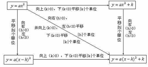 ③在画y=ax2+bx+c的图象时,可以先配方成y=a(x-h)2+k的形式,然后将y=ax2的图象上(下)左(右)平移得到所求图象,即平移法;也可用描点法:也是将y=ax2+bx+c配成y=a(x-h)2+k的形式,这样可以确定开口方向,对称轴及顶点坐标。然后取图象与y轴的交点(0,c),及此点关于对称轴对称的点(2h,c);如果图象与x轴有两个交点,就直接取这两个点(x1,0),(x2,0)就行了;如果图象与x轴只有一个交点或无交点,那应该在对称轴两侧取对称点,(这两点不是与y轴交点及其对称点),一般画图象找5个点。