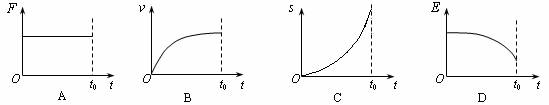 19.一物体沿固定斜面从静止开始向下运动,经过时间t0滑至斜面底端。已知在物体运动过程中物体所受的摩擦力恒定。若用F、v、s和E分别表示该物体所受的合力、物体的速度、位移和机械能,则下列图象中可能正确的是------------------( )