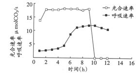 在充满N2与CO2的密闭容器中,用水培法栽培几株番茄,CO2充足。测得系统的呼吸速率和光合速率变化曲线如图11,请回答问题。