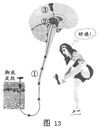 27.如图13所示,铁钉刺入某人的脚底,随即她产生了一系列的反应。请回答问题。