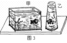 8.如图3所示,桌面上放有甲、乙两个鱼缸,同学们观察、