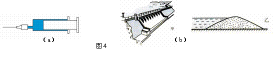 11.物理知识在生产和生活中有着广泛的应用。在图4(a)中,针筒吸取药液利用的是_______的知识;针尖做得尖锐是为了能产生很大的_________。如图4(b)所示,拦河大坝设计成下宽上窄形状的依据是根据 (选填“固体压强”或“液体压强”)规律;在建造大坝时,利用____________知识可估算混凝土的质量。(均填写所学物理概念或规律的名称)