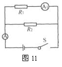 在如图11所示的电路中,电阻R1的阻值为10欧。闭合电键S,电流表Al的示数为0.3安,电流表A的示数为0.5安,试求: