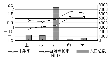 读“我国部分省区某年人口出生率、人口自然增长率和人口总数的统计图”(图13),回答23-24题。