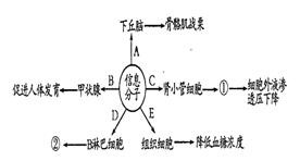 (7分)右下图是人体内某些信息分子作用的示意图,字母A-E表示信息分子,数字表示相关生理变化。请据图回答: