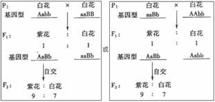 [解析]本题是基因对形状的控制、自由组合定律的应用、基因工程三个知识点的综合题。根据图解可以确定紫色花这种性状是由两对等位基因控制的,表现型与基因型之间的关系如下:A B (紫色) A bb(白色) aaB (白色)aabb(白色)。后代表现型的比例是1∶1,一定是测交,由于是两对基因控制,应该是一对基因测交,另一对基因不会白线出性状分离,所以是AAbb×aaBb 或 Aabb×aaBB。让AaBb基因型的进行自交,雌配子四种(AB、Ab、aB、ab)雄配子四种(AB、Ab、aB、ab),配子的结合是随机的,得到9A B (紫色),3A bb(白色) ,3aaB (白色) ,1 aabb(白色),因此紫色对白色是9:7。如果中间产物表现出红色,那基因型为A bb表现为红色。