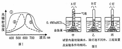 42.(7分)有A、B、C三种灯泡,其发出光波的波长与光辐射强度的关系如下图I所示,现需从中选择一种灯泡用于温室中给植物补光,期望最大限度地增加光合作用的强度。为此某同学设计了图Ⅱ所示的实验装置, 请分析回答下列问题:(注:叶绿体中的色素主要吸收430~450nm的蓝紫光和640~660nm的红橙光)