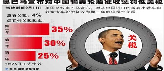 美国总统奥巴马9月11日宣布,对从中国进口的所有小轿车和轻型卡车轮胎征收为期三年的惩罚性关税。对中国输美轮胎征收的惩罚性关税税率第一年为35%,第二年为30%,第三年为25%。