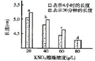将同一新鲜马铃薯块茎切成4根粗细相同长为5cm的条,再将这4根马铃薯条分别放在不同浓度的KNO3溶液中,依次在30分钟和4小时时测量每一根的长度,结果如图所示。下列结论错误的是