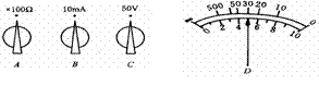 II.(9分) 如图所示,A、B、C是多用表在进行不同测量时转换开关分别指示的位置,D是多用表表盘指针在测量时的偏转位置。