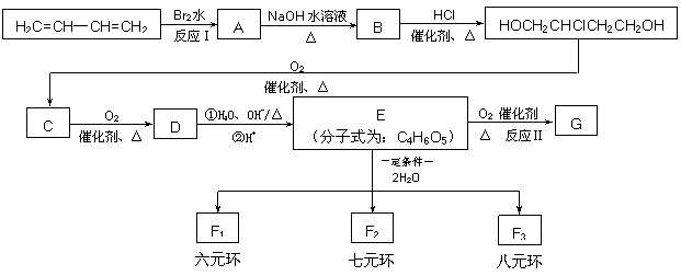 从石油裂解中得到的1,3-丁二烯可进行以下多步反应,也能得到苹果酸(下图中的物质E)。苹果酸在一定条件下,每两分子发生分子间脱水生成三种环酯F1、F2、F3。