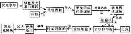 下面是我国胎兔(妊娠20天左右的兔胚胎)背部皮肤成纤维细胞克隆试验的基本过程: