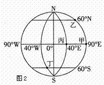 图2中,有甲地(0°,90°E)、乙地(60°N,90°E)、丙地(0°,40°E)、丁地(60°S,40°W)四地,据图回答2-3题