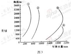 [例题](09年北京文综) 图3显示中国不同地区山地年降水量从山麓到山顶的变化。读3,回答第4、5题。