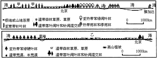 下图中,上图为从雅加达到北京附近沿经线的植被分布示意图,下图为经北京附近沿纬线的植被分布示意图。读图回答10-11题。