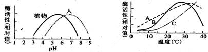 18.下图表示的是pH值对植物和人的淀粉酶活性的影响;右下图表示的是3种脱氢酶(A、B、C)的活性受温度影响的影响。下列叙述正确的是 ( )