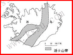 冰岛位于大西洋中北部,它由沿裂谷溢出的上地幔物质堆积而成。冰岛有“极圈火岛”之称。该岛冬季温和,1月平均气温在0℃左右,夏季气温不高,7月平均气温在10℃。苔原是冰岛主要的地带性植被。结合冰岛活火山带分布图,回答6-7题。![]()