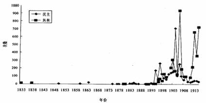 11.右图为1833-1913年“共和”、“民主”这两个关键词在部分著作和报刊中出现频率的统计图。1905-1913年“共和”出现的频率远远高于“民主”的频率,其原因包括( )