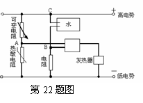 22.下图是热水器系统的恒温器集成电路,当温度低时,热敏电阻的阻值很大,温度高时热敏电阻的阻值就很小,只有当热水器中有水且水的温度低时,发热器才会开启并加热;反之,便会关掉发热器。如果热水器中没有水时,电路中B点处于 电势(填“高”或“低”),这个逻辑电路是 门电路。
