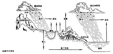 蒸发、 输送、 凝结、降水、径流下渗等 |