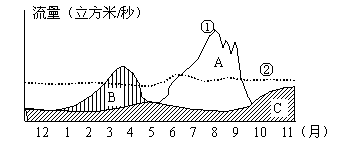 (1)该河表示我国东北地区某河流的径流量变化示意图,ABC分别表示河流的三种补给形式:A B C