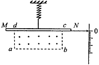 图为一电流表的原理示意图。质量为m的均质细金属棒MN的中点处通过一绝缘挂钩与一竖直悬挂的弹簧相连,弹簧劲度系数为k。在矩形区域abcd内有匀强磁场,磁感应强度大小为B,方向垂直纸面向外。与MN的右端N连接的一绝缘轻指针可指示标尺上的读数,MN的长度大于
