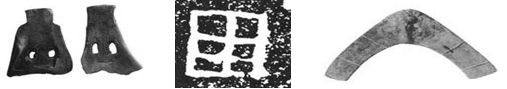 图一骨耜 图二 甲骨文中的“田”字 图三 战国时期的铁口犁