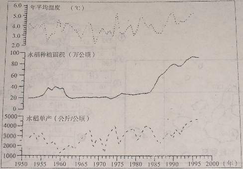 材料二:1950-1999年黑龙江省气温变化、水稻种植面积变化及其单产变化图