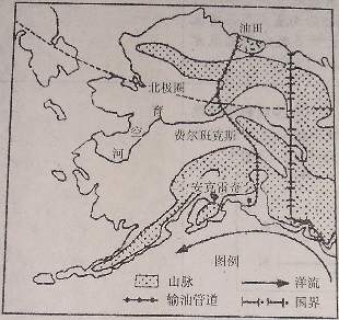 29.阿拉斯加是美国的第49个州,面积为171万平方千米,森林、渔业、黄金、石油等资源丰富。1867年美国以720万美元、平均每英亩二分钱的价格从俄国购得。土著居民为爱斯基摩人、阿留申人和印第安人,其他种族被称为“新定居者”(New Settlers)。目前阿拉斯加州人口仅60多万,人口密度0.42人/平方公里。其中白人占67.6%,土著居民占15.6%,拉美裔人占4.1%,亚裔人占4%,黑人占3.5%,混血儿占5.4%。请结合美国阿拉斯加州简图,回答下列问题。