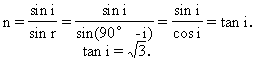 例题7.光线以300入射角从玻璃中射到玻璃与空气的界面上,它的反射光线与折射光线夹角为900,则这块玻璃的折射率应为: