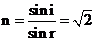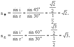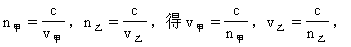 例题9.光线从空气射入甲介质中时,入射角i=45°,折射角r=30°,光线从空气中射入乙介质中时,入射角i′=60°,折射角r′=30°.求光在甲、乙两种介质中的传播速度比.