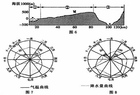 (28分)图1是“沿32°N局部地区地形剖面图”,图2、图3分别是“气温降水玫瑰图”,读图回答下列问题: