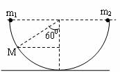 21.如图所示,半原形光滑轨道固定在水平地面上,并使其轨道平面与地面垂直,物体m1、m2同时由轨道左、右最高点释放,二者碰后粘在一起向左运动,最高能上升到轨道M点,如图所示.已知OM与竖直方向夹角为600,则两物体的质量之比m1:m2为 ( )
