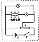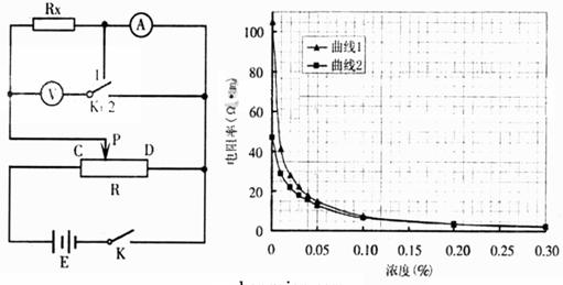 某研究性学习小组设计了题22图3所示的电路,用来研究稀盐水溶液的电阻率与浓度的关系.图中E为直流电源,K为开关,K1为单刀双掷开关,V为电压表,A为多量程电流表,R为滑动变阻器,Rx为待测稀盐水溶液液柱.