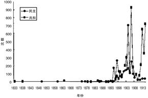 “共和”、“民主”在1833-1915年的出现频度统计