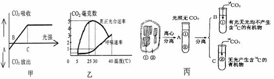 (3)丙图装置C中产生含碳有机物是由于在装置A中结构[ ] 进行了 ,从而为该物质的形成提供了所需条件的缘故;装置B中不能产生含14C有机物的主要原因是结构①中缺少 。