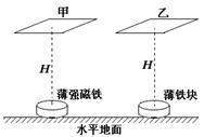 19、如图所示,甲、乙是两块完全相同的铜片,两者间水平距离足够远,现在甲的正下方放置一薄的强磁铁,乙的正下方放置一薄铁块,现将甲、乙拿至相同高度H处同时释放(铜片下落过程中不翻转),则以下说法正确的是:( )