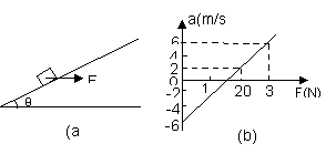 浙江省温州市十校联合体2010届高三期中联考如图(a)所示,用一水平外力F拉着一个静止在倾角为θ的光滑斜面上的物体,逐渐增大F,物体做变加速运动,其加速度a随外力F变化的图像如图(b)所示,若重力加速度g取10m/s2.根据图(b)中所提供的信息可以计算出( AB )