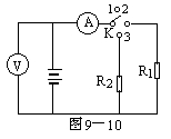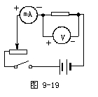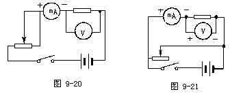 错解一:如图9-19所示,此种连法错在变阻器的右下接线柱和电源的负极之间少连了一条线,即使变阻器取最大值,通过电路的电流也超过了10mA,大于毫安表的量程。