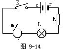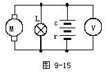 例11 电动机M和电灯L并联之后接在直流电源上,电动机内阻r′=1Ω,电灯灯丝电阻R=10Ω,电源电动势ε=12V,内阻r =1Ω,当电压表读数为10V时,求电动机对外输出的机械功率。