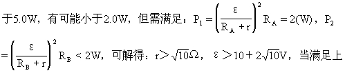 例12 把一个“10V 2.0W”的用电器A(纯电阻)接到某一电动势和内阻都不变的电源上,用电器A实际消耗的功率是2.0W,换上另一个“10V 5.0W”的用电器B(纯电阻)接到这一电源上,用电器B实际消耗的电功率有没有可能反而小于2.0W?你如果认为不可能,试说明理由,如果认为可能,试求出用电器B实际消耗的电功率小于2.0W的条件(设电阻不随温度改变)